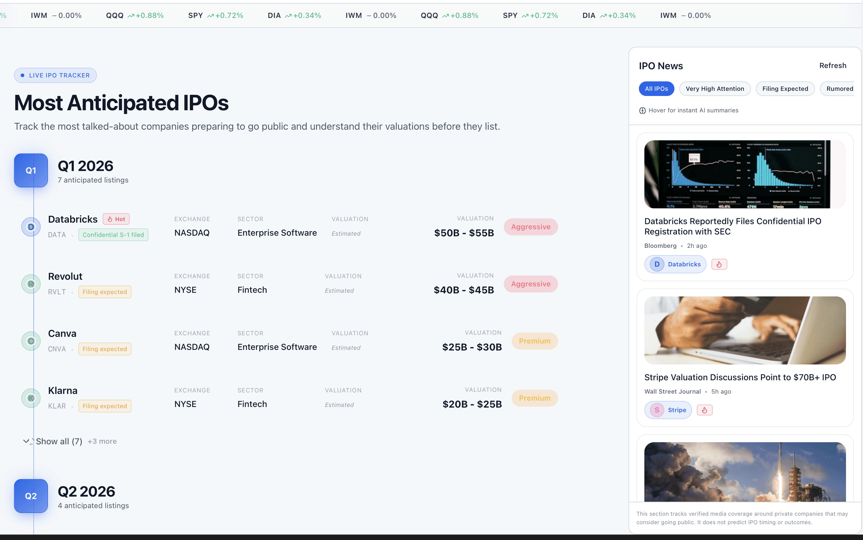 See IPO filings, valuation ranges, and demand signals before listing.